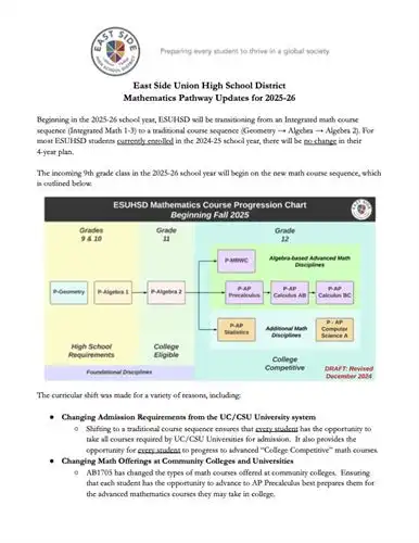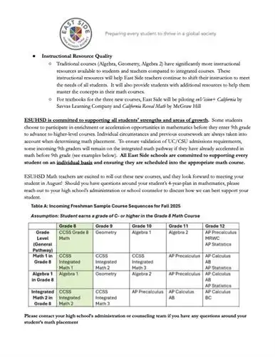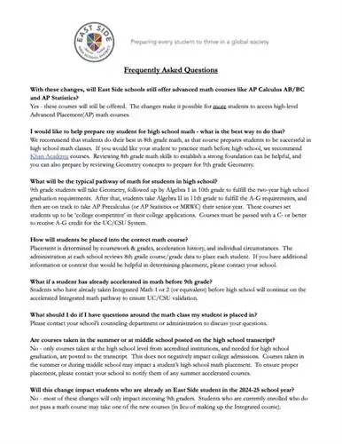 All courses meet the Mathematics graduation requirements. Students are required to earn 20 mathematics credits and earn passing grades in two years of mathematics courses (typically Integrated Mathematics 1 and 2);culminating in at least 1 year of Calculus; for students entering into high school and taking Integrated Mathemtics 1, this will likely necessitate at least 1 summer accelerated course.
